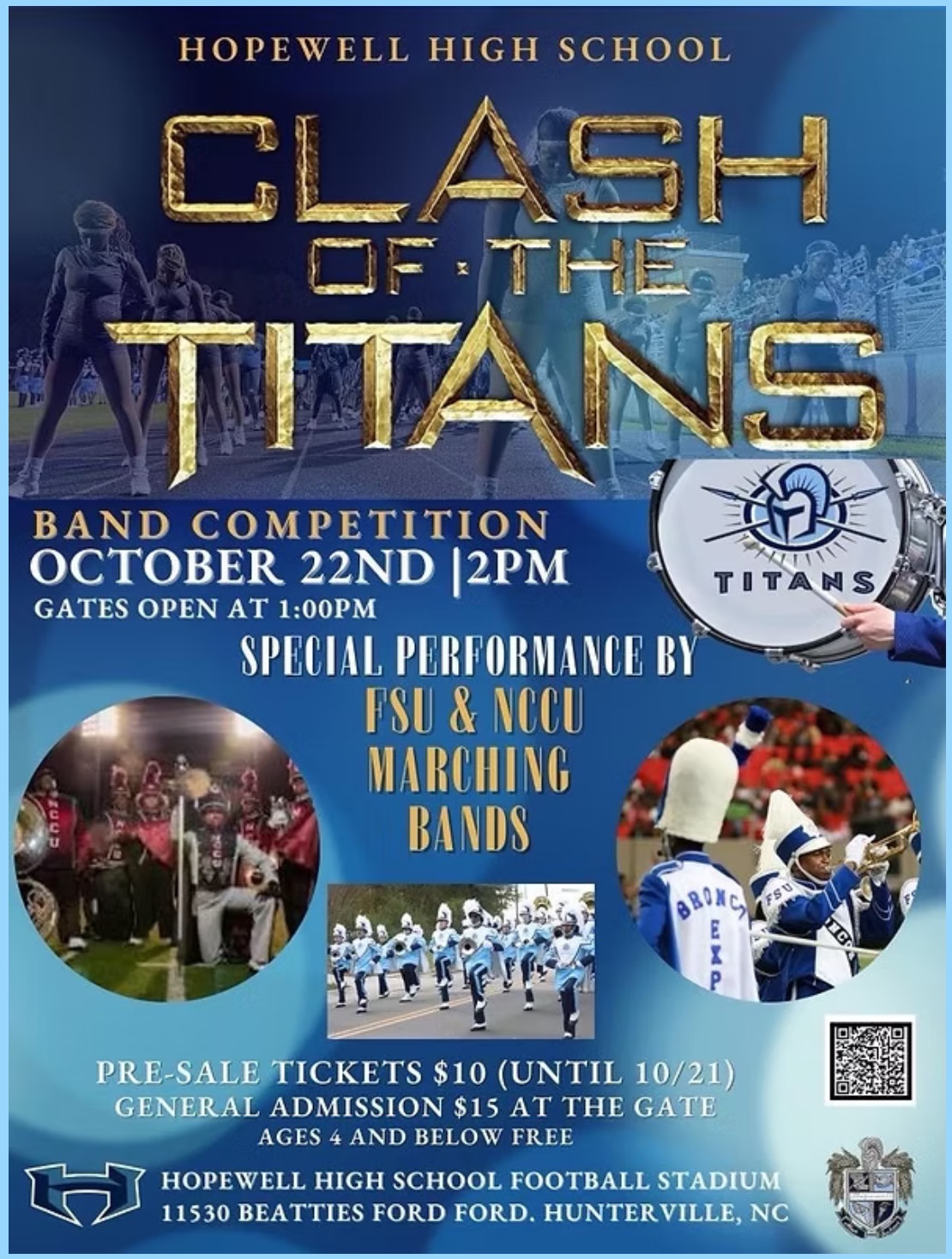 Clash Of The Titans October 22, 2025 Hopewell High School Football Stadium 11530 Beaties Ford Road, Hunterville, NC, United States MME will be at Hopewell High School's Clash Of The Titans