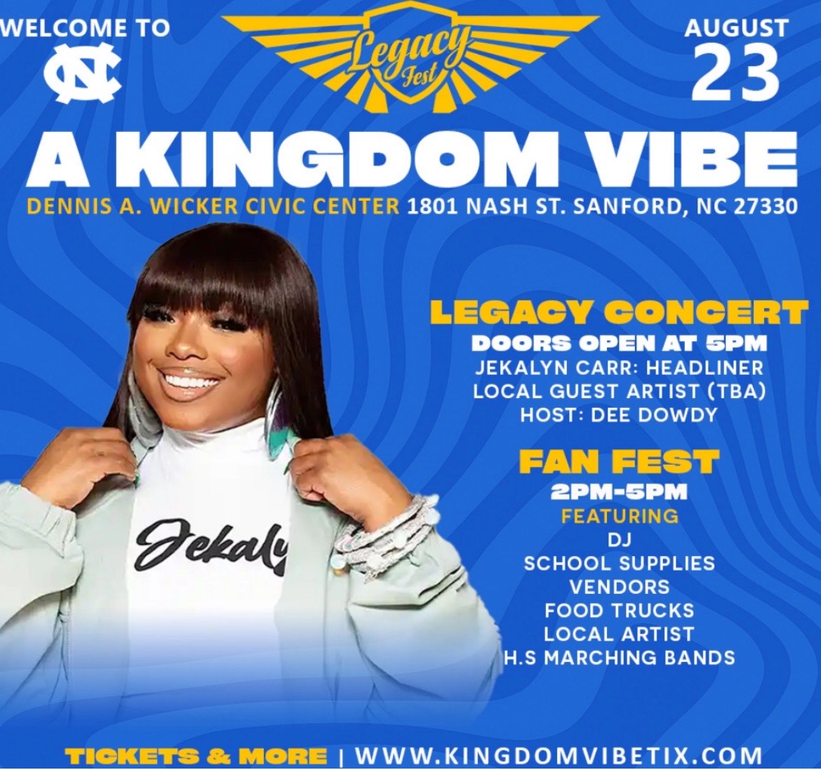 FANFEST Featured August 23, 2025 @ 2:00 pm - 5:00 pm Dennis A Wicker Civic Center 1801 Nash St., Sanford, NC, United States Band Performance Saturday - August 23 2pm-5pm Dennis A Wicker Civic Center 1801 Nash St. Sanford, NC 27330